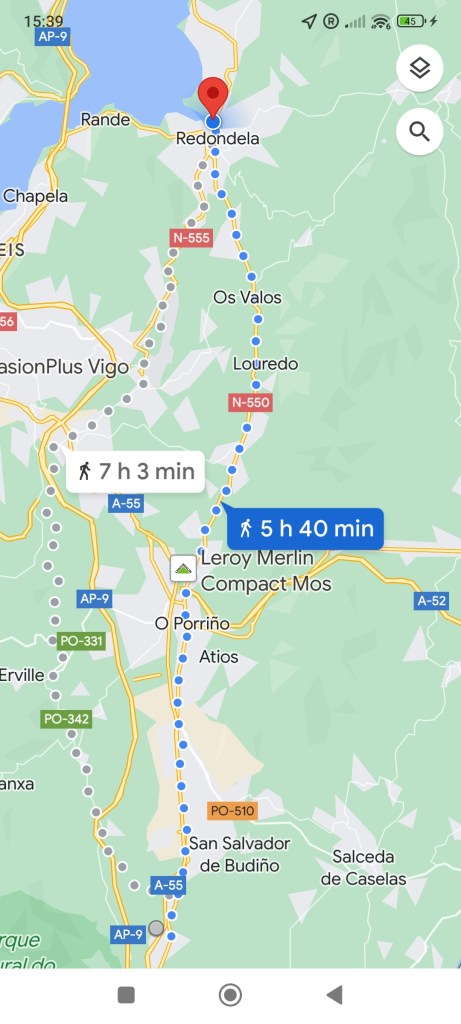 d) Itinéraire du 15 octobre 2023 de Albelos à Redondela et géolocalisation.