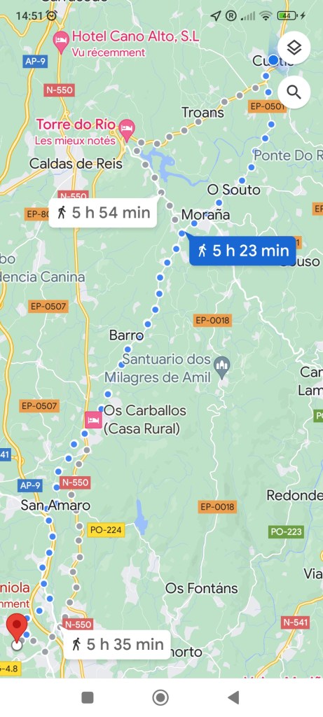 Itinéraire de Pontevedra à Cuntis via San Amaro, Barro, Moragna et Cuntis. Cuntis est connu pour être une station thermale.